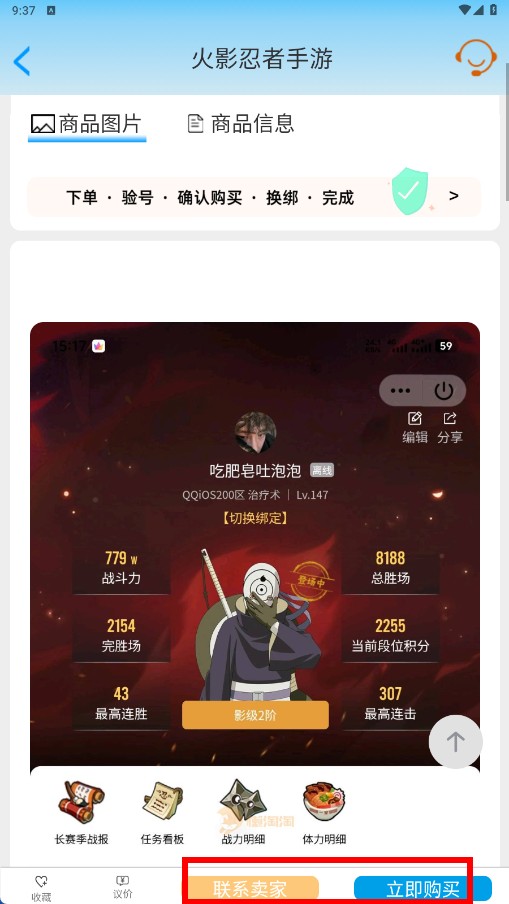 4、进入【火影忍者手游】账号详情页,可点击【联系卖家】或【立即购买】,完成账号交易。