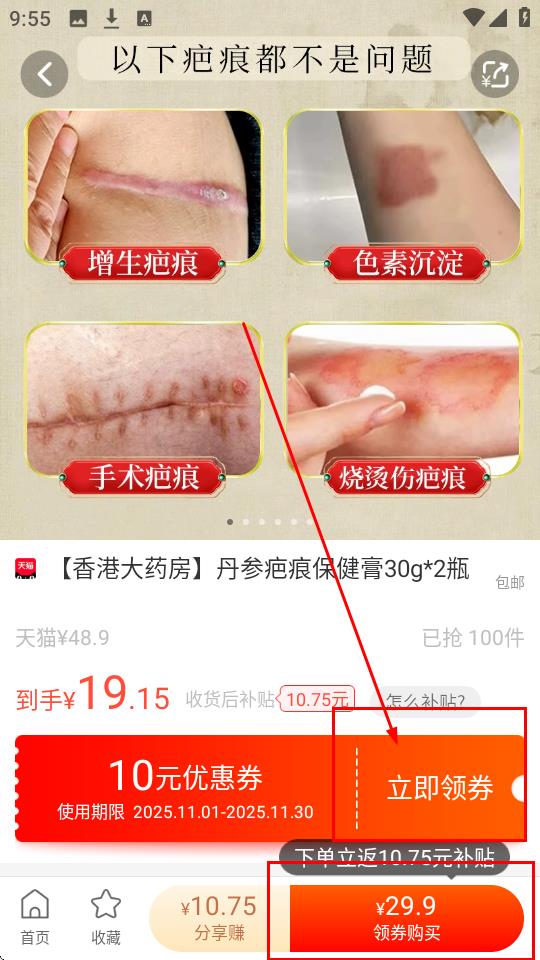 2、在商品详情页点击【立即领券】,领取优惠券后点击【领券购买】,就能优惠购买啦。