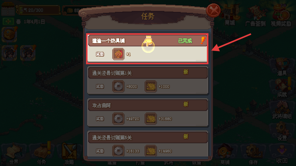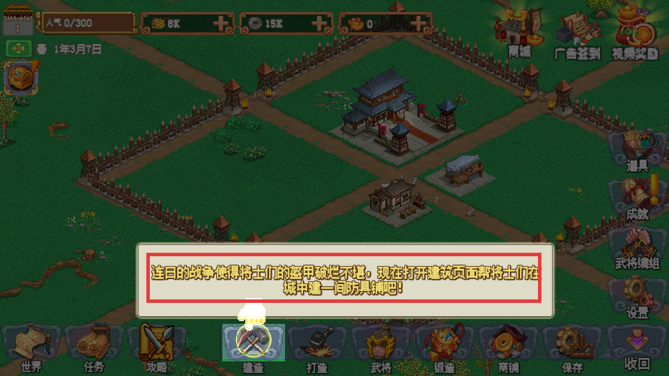 4、完成【建造一个防具铺】任务后,领取奖励,积累资源,为招募武将、提升城池实力做准备。