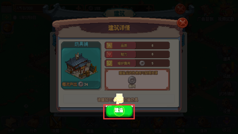 2、依据任务提示,点击【建造】按钮进入建筑页面,为将士建造【防具铺】,保障装备供应。