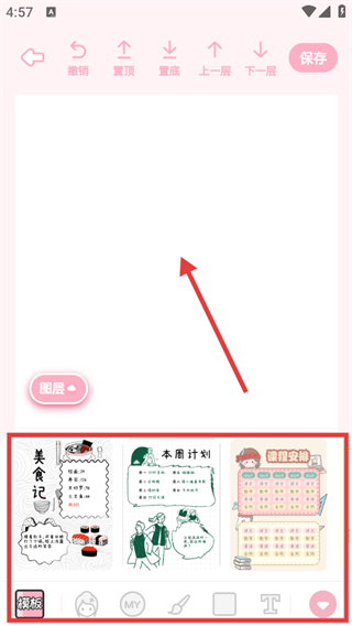 4、在创作编辑界面,可利用底部模板、工具等进行创作,完成后点击【保存】即可。