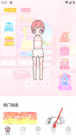 2、在主页可查看角色装扮,点击底部【手帐】选项,可进入手帐模板页面。
