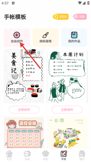 3、在手帐模板页面,点击【自由创作】选项,可进入手帐创作编辑界面。