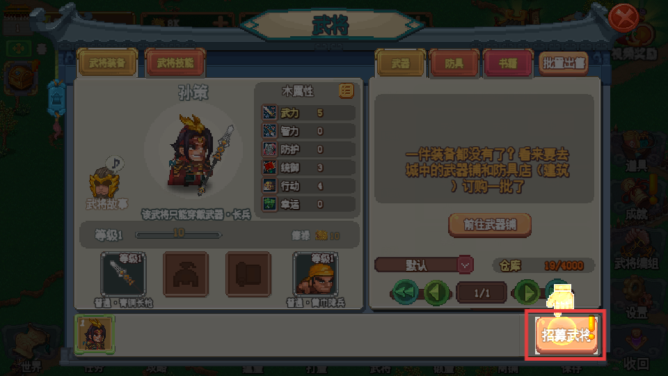 1、点击【招募武将】按钮,可获取新武将,壮大队伍力量,提升战斗能力,更好消灭敌人。