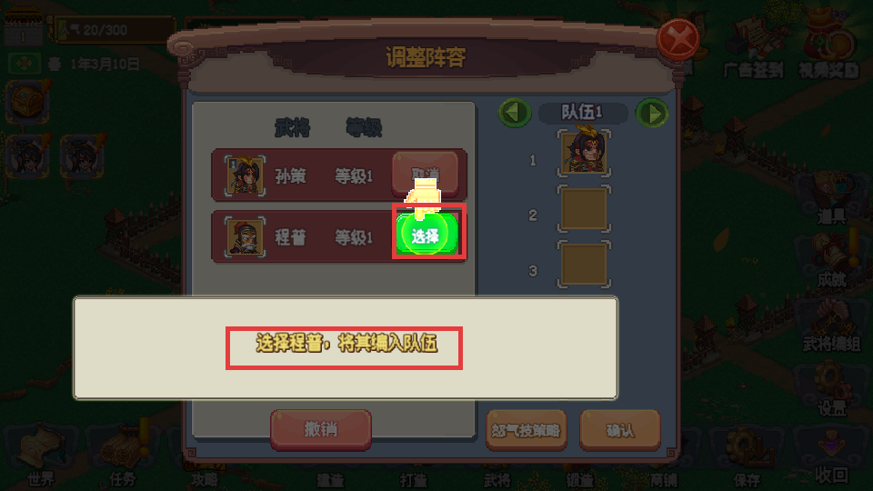 2、点击【程普】旁的选择按钮,将其编入队伍,优化阵容配置,为战斗做好准备。