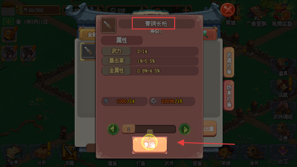 3、收集够资源后,点击制造【青铜长枪】,提升武将武器战力,助力战场战斗。