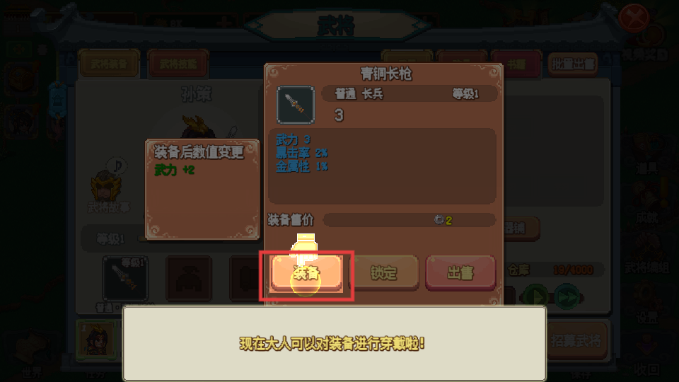 4、点击装备【青铜长枪】,武将武力加2,增强战斗能力,守护城市更轻松。