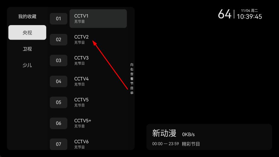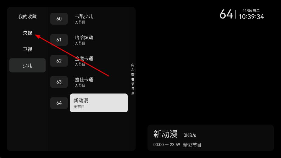2、在频道列表中,点击【央视】,进入央视频道列表页面。