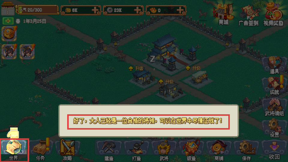 1、点击【世界】开启征战,依托前期建设成果,在乱世冒险发展,积极征战壮大势力。