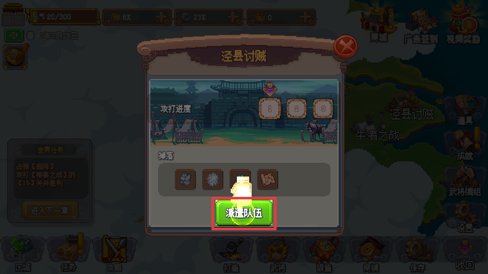 2、进入【泾县讨贼】,点击【派遣队伍】讨伐,获取资源,推进关卡与势力发展。