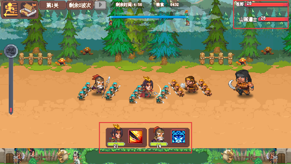 3、战斗时观察武将【21】【14】血量,适时放技能,击败【祖郎-28】【山贼道士-26】保胜利。