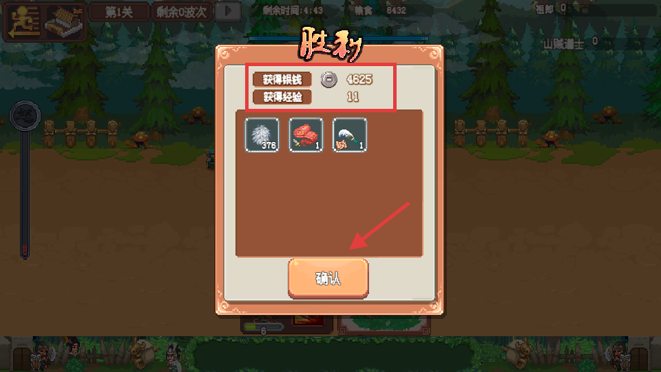 4、战斗胜利后,查看【4625】铜钱、【11】经验等,点击【确认】领奖励,积累资源再战。