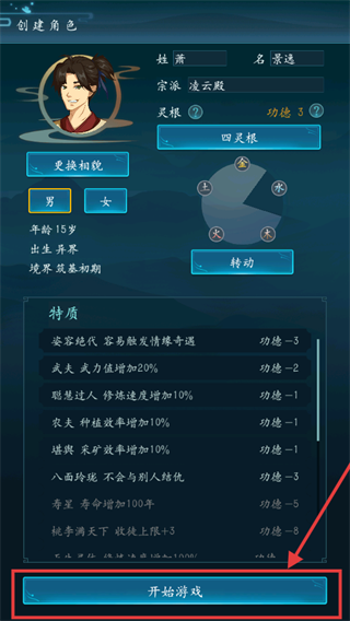 1、创建角色时,按需选特质(如【聪慧过人】增修炼【百分之10】等),选后点击【开始游戏】,开启宗门修仙之旅。