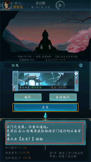 2、宗门发展需资源,按指引点击【出发】,前往后山除魔,获取维持宗门运行的必备资源。