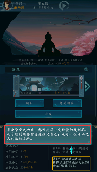 3、除魔成功获【灵石】【278】-【甘草】【285】等战利品,需合理分配资源,强化自身与宗门,助修仙发展。