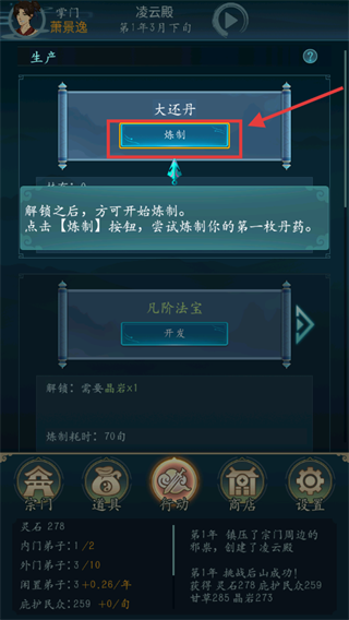 4、解锁【大还丹】炼制后,点击【炼制】按钮,尝试炼制第一枚丹药,提升修仙能力。