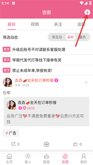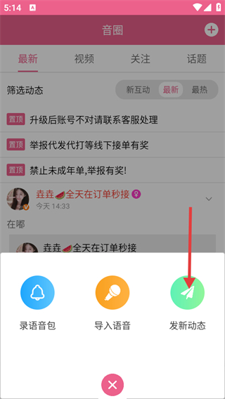2、在音圈页面,点击右上角【+】按钮,可弹出功能选择菜单。