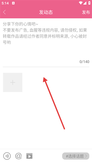 4、在发动态界面,可输入心情文字并添加图片,编辑完成后点击【发布】即可分享动态。