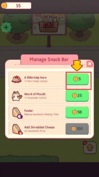 4、升级管理选项,如增加兼职猫咪、提升口碑等,优化小吃店运营,增加收益。