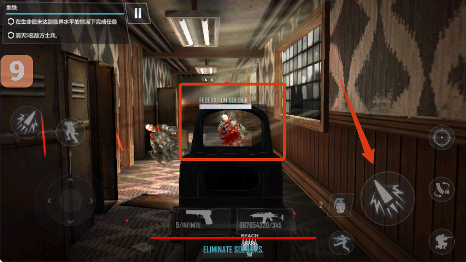 4、遭遇敌方士兵(如联邦士兵)时,利用武器瞄准并射击,消灭敌人,完成击杀目标,顺利推进任务。