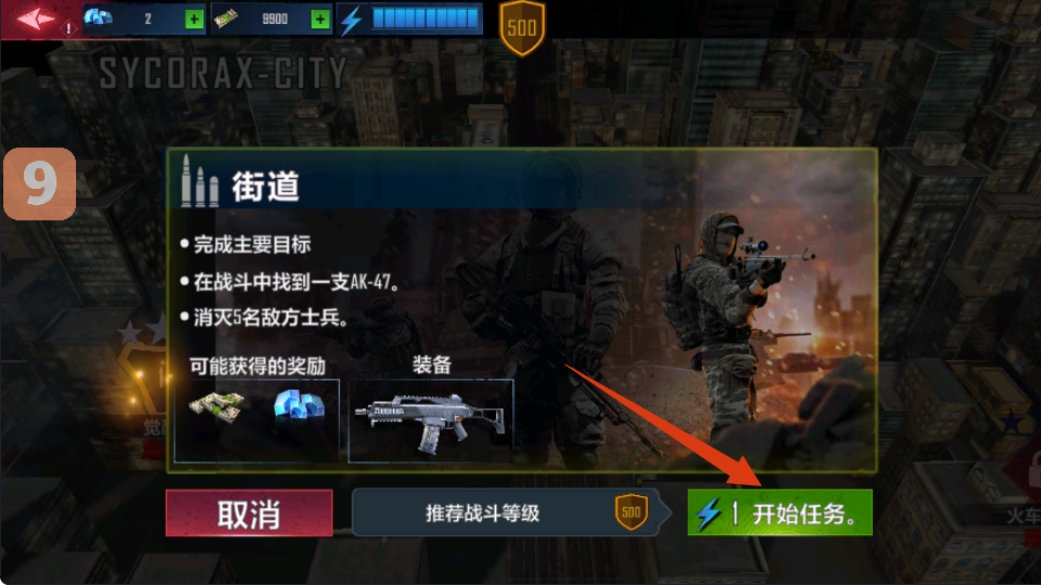 1、在任务选择界面,选择“街道”等任务,点击【开始任务】按钮,进入战斗场景。