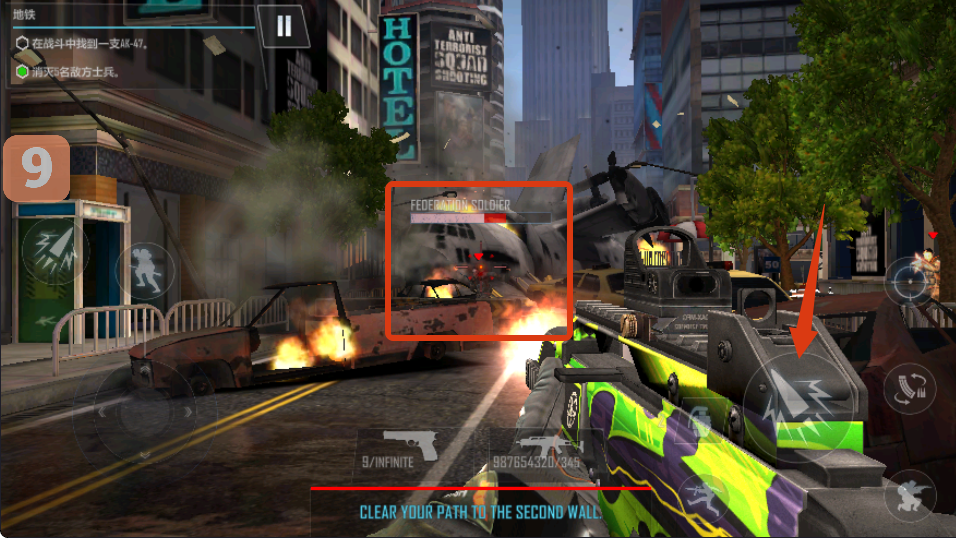 3、遭遇敌方士兵(如联邦士兵)时,利用武器瞄准并射击,消灭敌人,完成击杀目标。