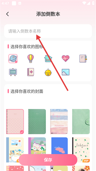4、在添加倒数本界面,输入倒数本名称,选择图标和封面后点击【保存】,可创建新的倒数本。
