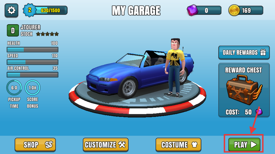 4、完成任务后点击绿色播放按钮继续游戏,积累距离以解锁新车辆并升级属性。
