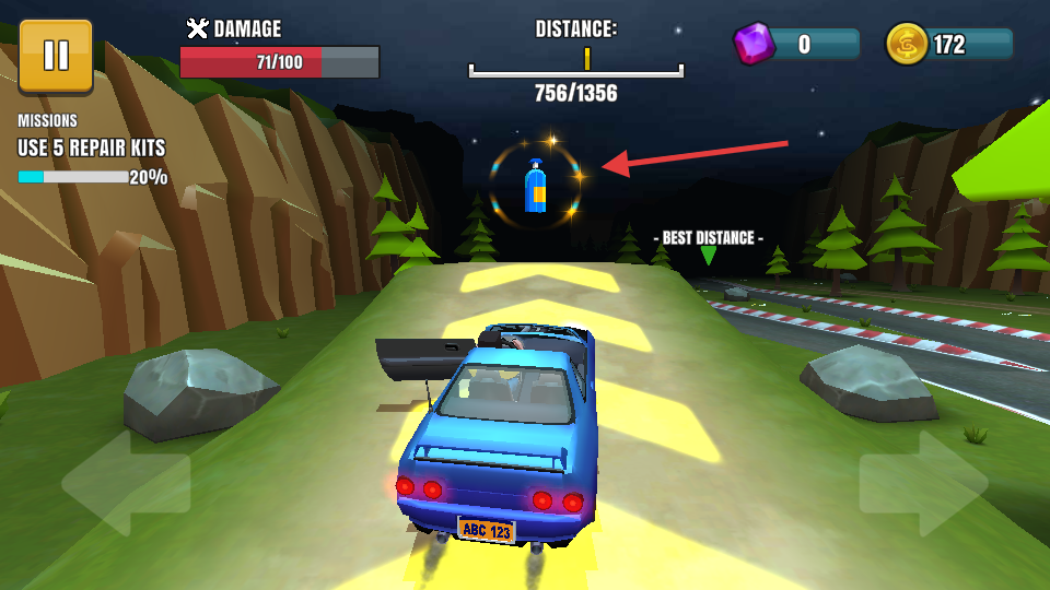 2、驾驶过程中躲避如翻转车辆的障碍物,防止【DAMAGE】值下降,尽量延长行驶距离。