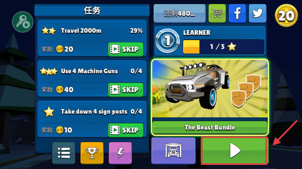 1、点击绿色播放按钮进入游戏,操控赛车,可先查看任务目标规划闯关策略。