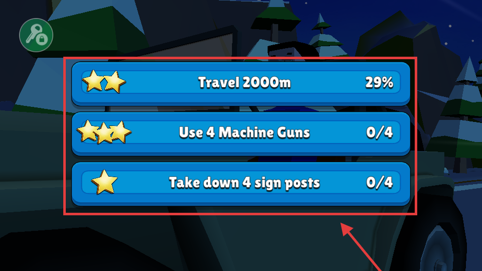 2、关注任务进度,行驶时尽量完成【Travel-2000m】【Use-4-Machine-Guns】【Take-down-4-sign-posts】任务,积累资源解锁内容。