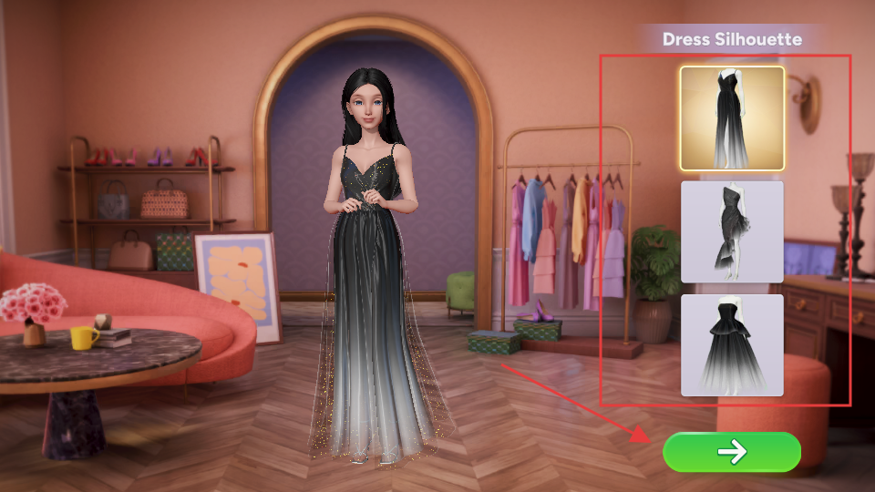 1、花费金币开启“DesignaGown”等服装设计任务,进入服装设计环节。