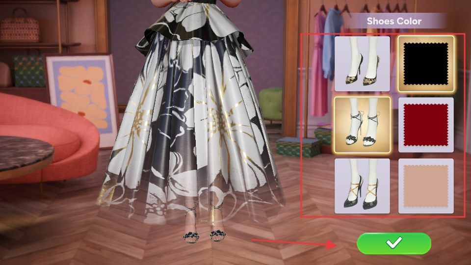 4、选择鞋子颜色和款式,完成服装的细节搭配,点击确认按钮完成设计。