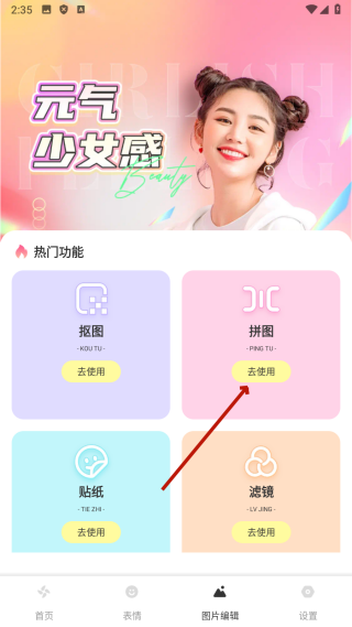 2、在图片编辑功能页面,点击【拼图】,进入图片选择页面。