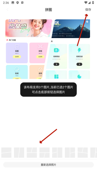 4、在拼图编辑页面【选择拼图布局】后点击【保存】,即可完成拼图制作并保存。