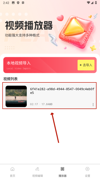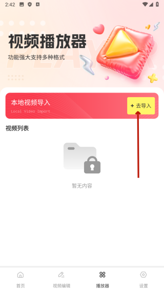 2、在视频播放器页面,点击【去导入】,进入视频选择页面。