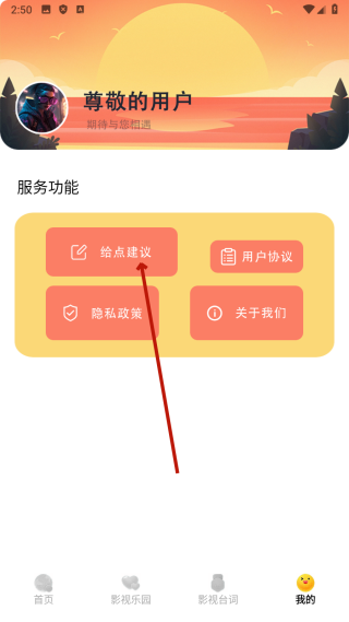 2、在个人中心页面,点击【给点建议】,进入建议反馈页面。