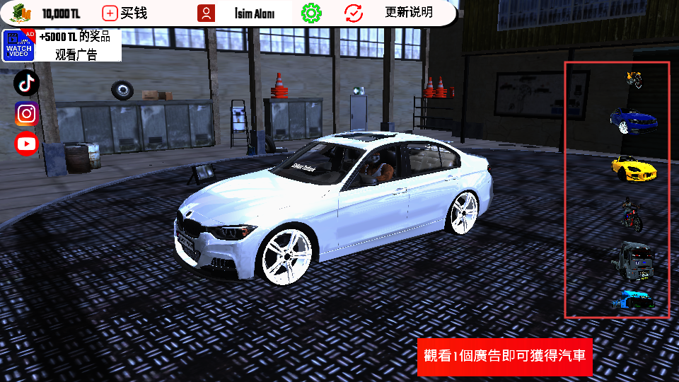 2、在车库界面,可选择不同车辆,部分车辆可通过观看广告获得,丰富驾驶体验。