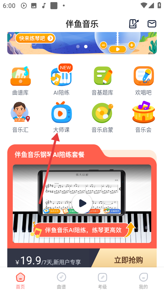 1、在伴鱼音乐首页,点击【大师课】可进入大师课板块。
