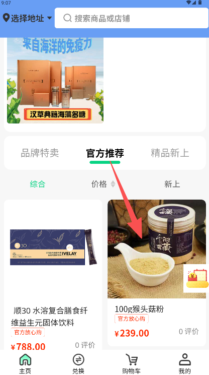 1、在首页“官方推荐”商品列表中浏览并点击目标商品。