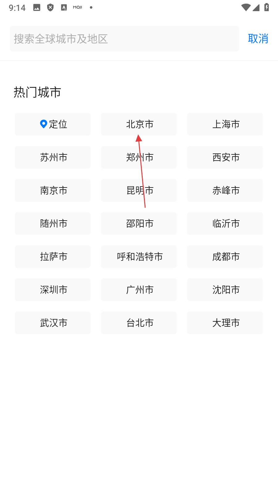 2、在城市管理页面,点击【添加城市】,进入城市选择页面。