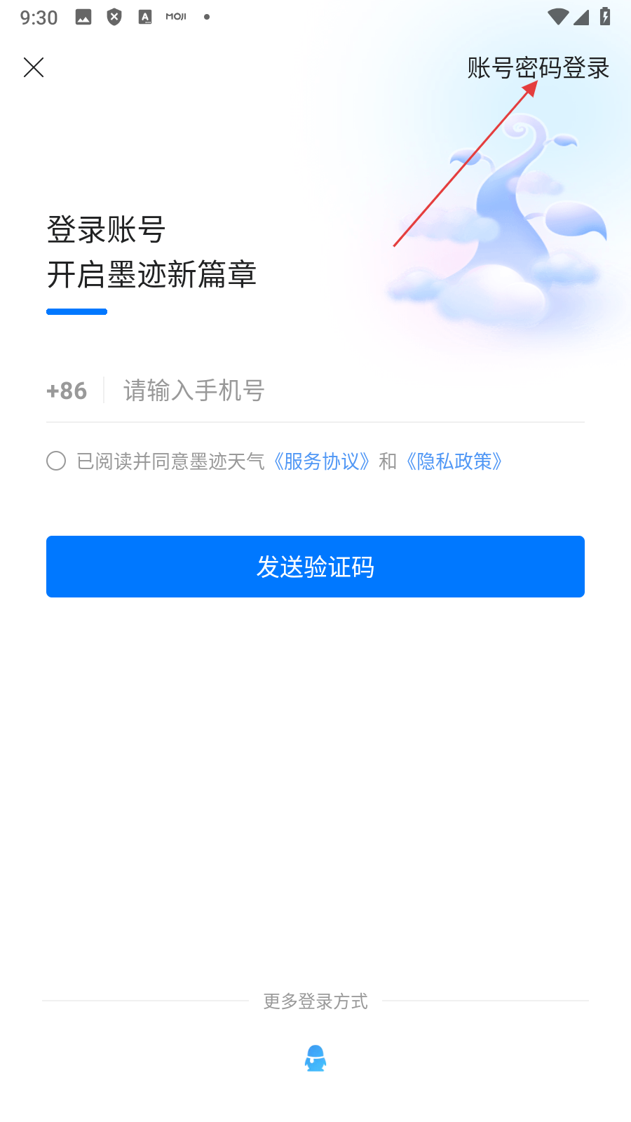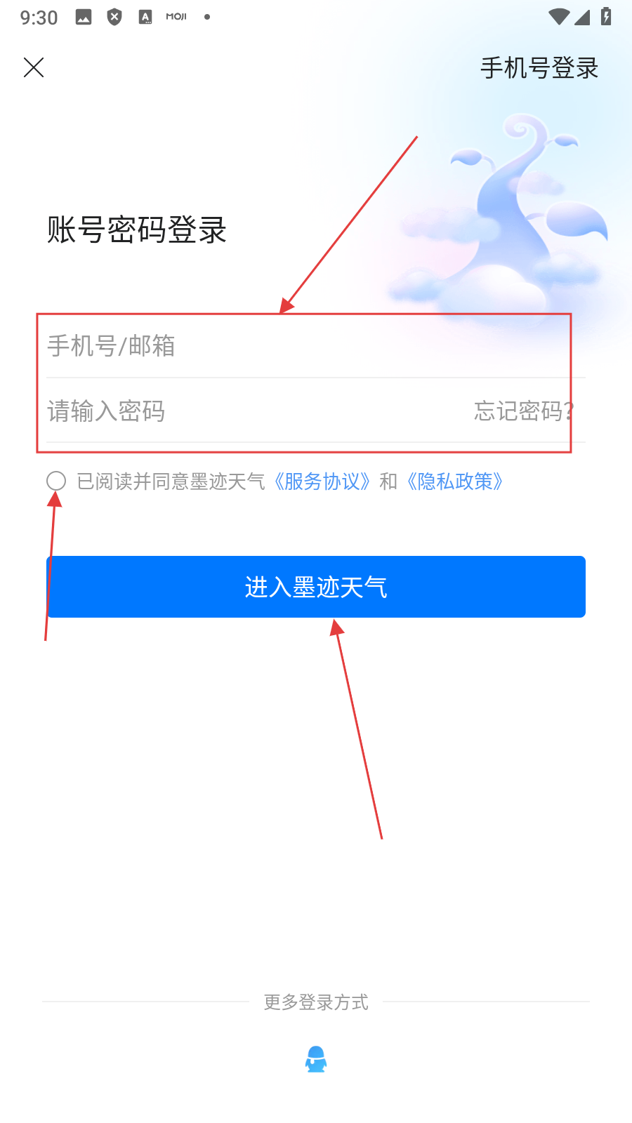 4、在页面中输入【信息,勾选协议】后点击【进入墨迹天气】,即可完成账号登录操作。