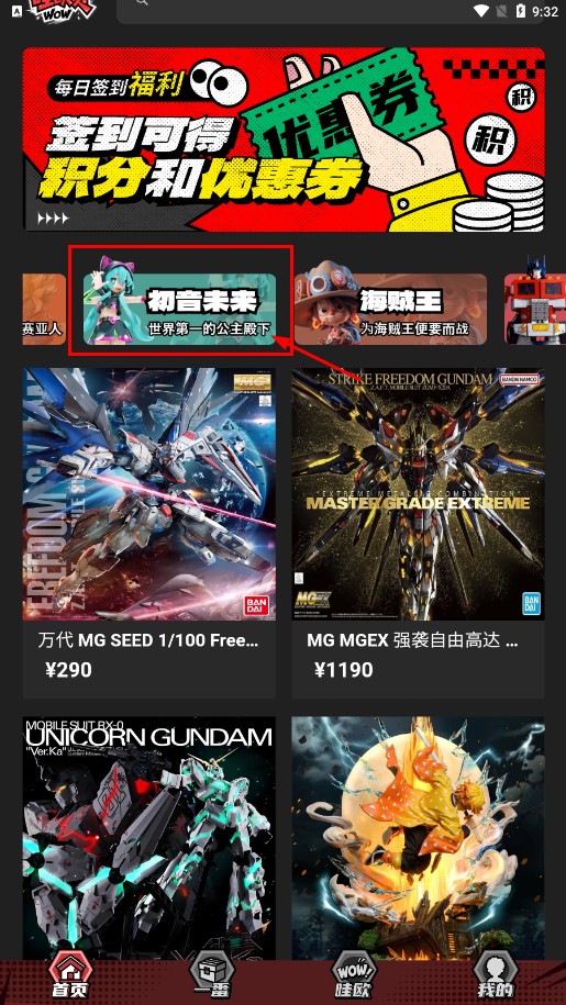 4、点击底部【哇欧-功能按钮】,进入对应页面,可查看高达机甲等商品。