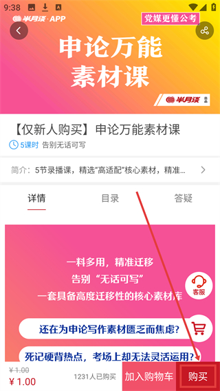 3、进入详情页,查看课程介绍后,点击右下角【购买】按钮,进入订单确认环节。