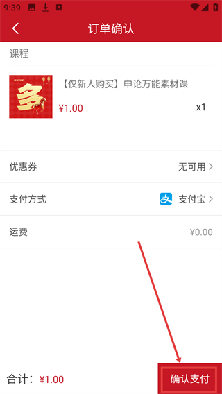 4、在【订单确认】页面,确认课程金额,选择支付方式后点击【确认支付】完成购买。