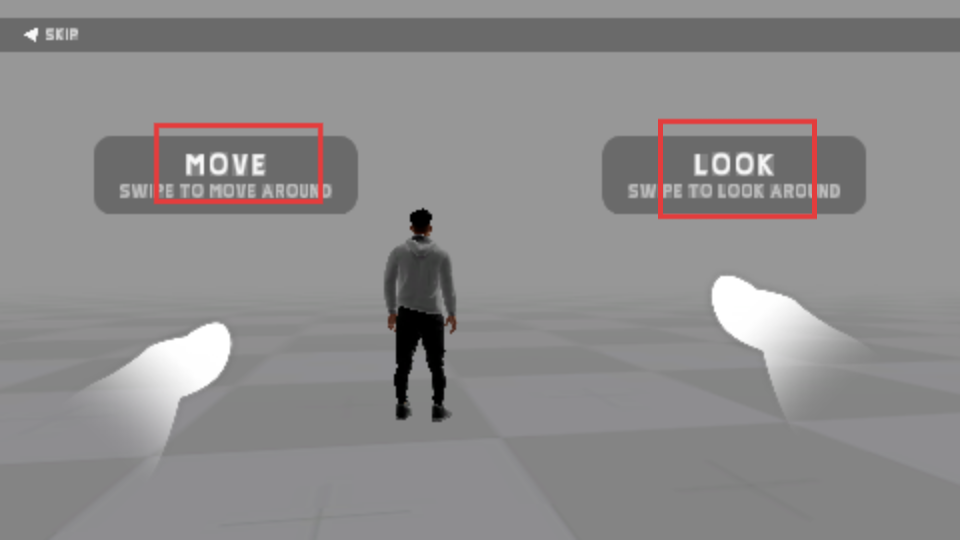 2、通过滑动操作分别控制【MOVE】移动和【LOOK】视角,熟悉角色移动与观察操作。
