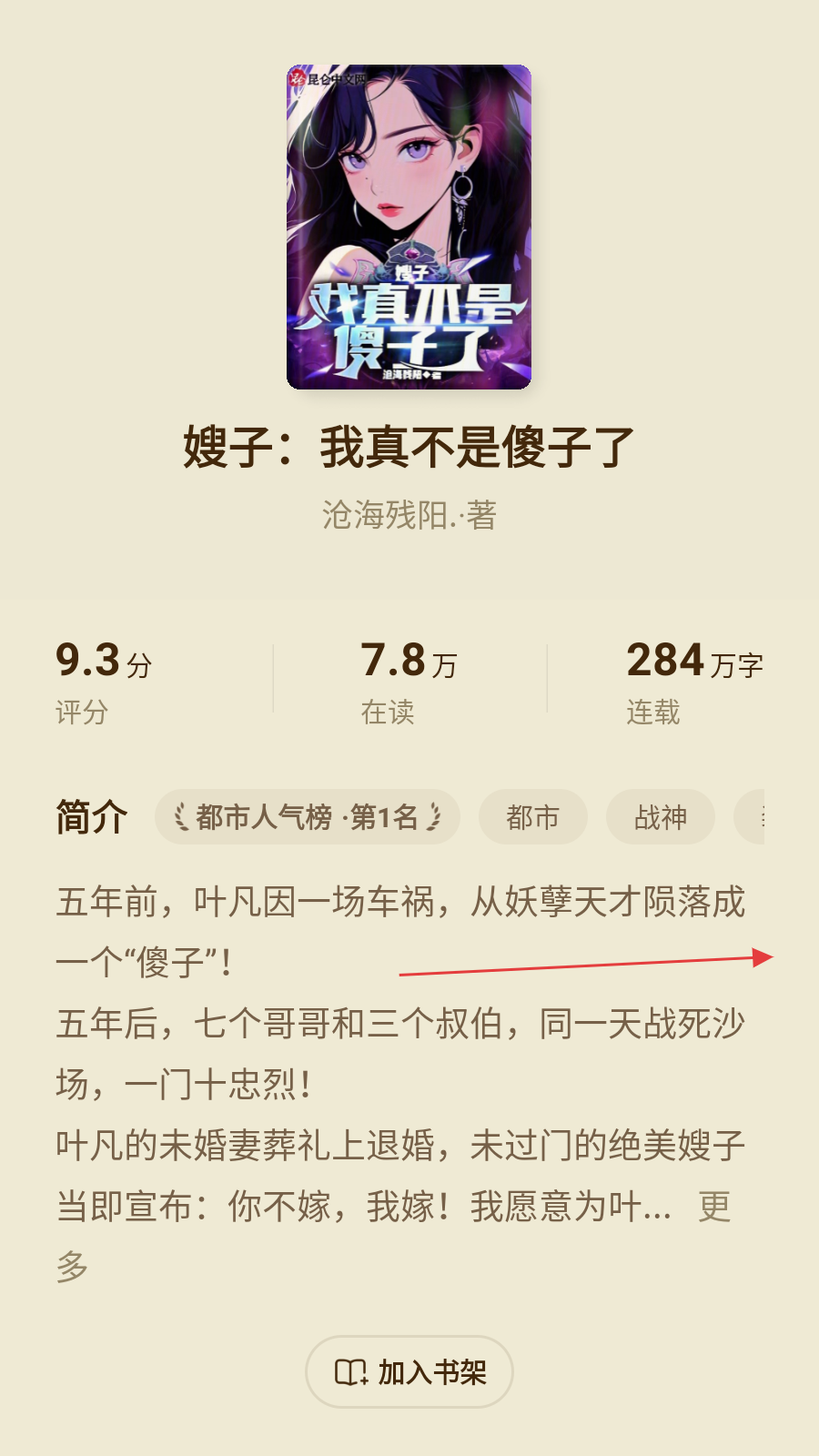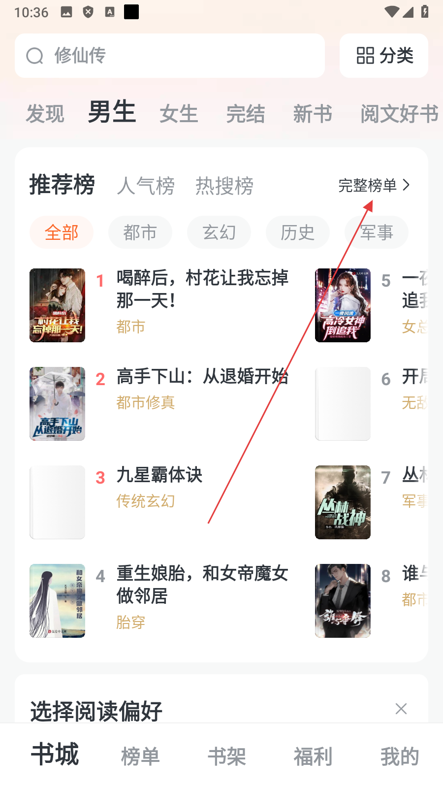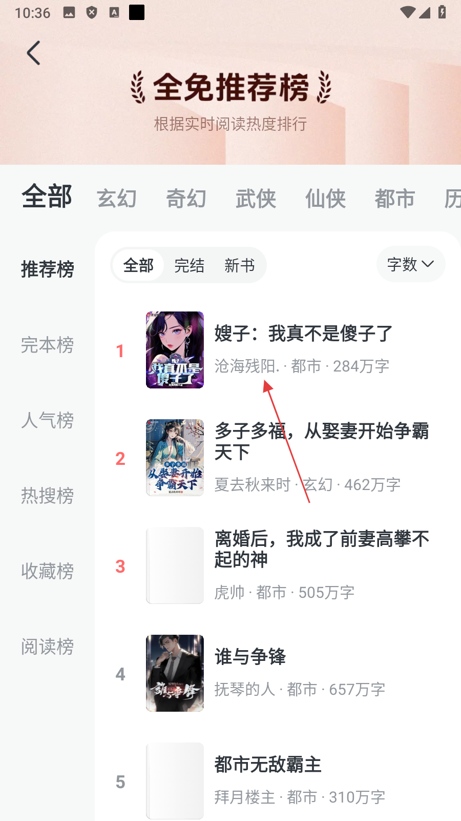 2、在全免推荐榜页面【点击目标小说】,进入小说详情页面。