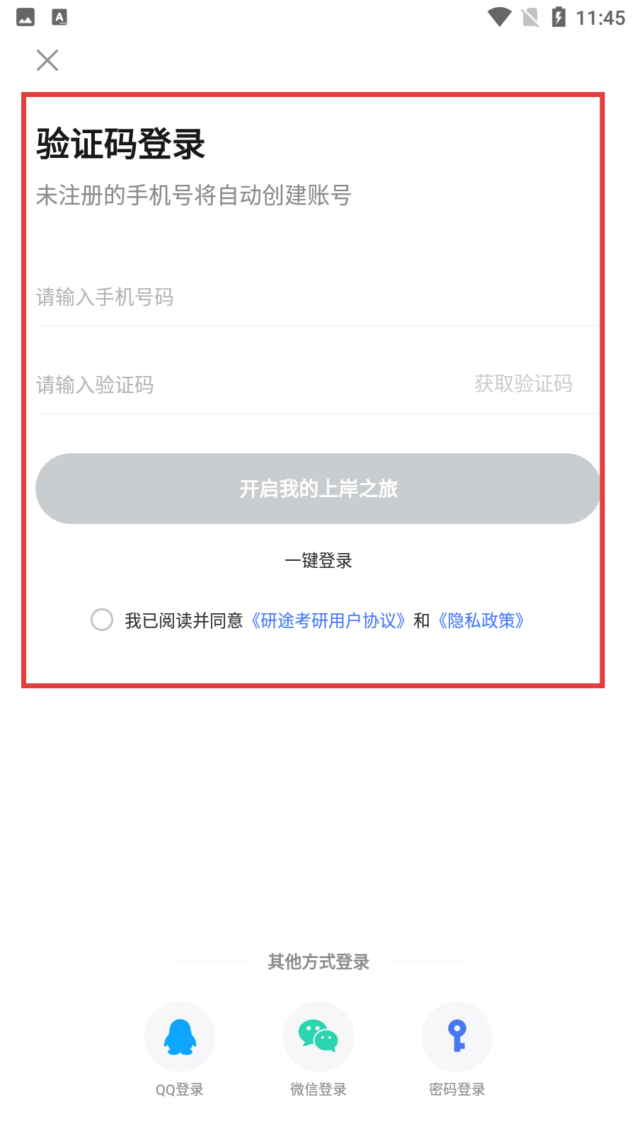 3、在登录界面,可选择验证码登录方式,输入手机号、验证码,点击【开启我的上岸之旅】按钮进行登录。