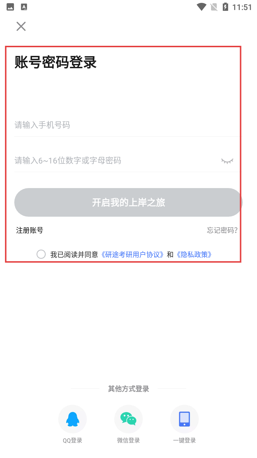 4、也可选择账号密码登录方式,输入手机号、密码,勾选同意相关协议后,点击【开启我的上岸之旅】按钮完成登录。