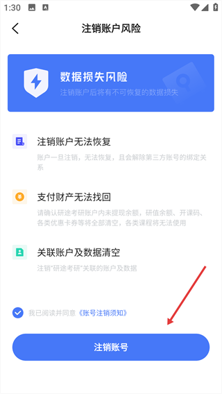 4、阅读注销风险,点击【注销账号】按钮,完成账户注销操作。